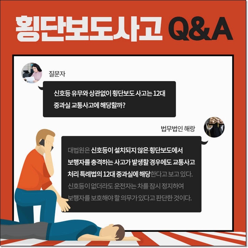 법무법인 대륜변호사법률상담 서울북부사무소 이혼회생파산서울특별시 도봉구 도봉로164길 43 3층법률문제를 해결하고 싶다면 법률문제를 해결하고 싶다면 blog. naver.com법률문제를 해결하고 싶다면 법률문제를 해결하고 싶다면 blog. naver.com법률문제를 해결하고 싶다면 법률문제를 해결하고 싶다면 blog. naver.com사람은 누구나 실수를 할 수 있어요. 외부 요인으로도 발생할 수 있지만 단순히 체크하지 못해 생기는 일일 수도 있습니다. 그럼에도 불구하고 단순히 실수만으로는 끝나지 않는 사안이 교통사고라고 할 수 있습니다. 피해자는 이로 인해 상당한 손실을 입게 됩니다. 그럼에도 불구하고 작은 피해를 끼쳤을 뿐인데 이에 대해 중징계를 받게 되면 당연히 억울할 수밖에 없습니다. 따라서 횡단보도 보행자 사고를 포함한 12대 중과실 교통사고를 제외한 사안에 대해서는 종합보험으로 무마가 가능합니다. 그러나 횡단보도 사고를 냈다면 처벌을 피할 수 없으므로 반드시 변호인과 자세한 사안에 대해 논의하고 피해자와 횡단보도 교통사고 합의금을 통한 합의 진행을 하여 교통사고 벌금형에 대비하는 자세가 필요합니다.일시정지 규칙을 위반한 것만으로도횡단보도는 말 그대로 평행선 위의 보도와 보도를 연결하는 보행자를 위한 길이라고 할 수 있습니다. 특히 시각적으로 명백히 노출되어 있는 공간임에도 불구하고 운전자의 중대한 과실로 인해 이를 확인하지 않고 그대로 횡단보도 보행자 사고가 발생하는 상황입니다. 따라서 현재는 일차적으로 횡단보도에서 보행자가 있거나 지나가는 행동이 포착될 경우 기본적으로 일시정지해야 함을 법률로 규정하고 있습니다. 이를 지키지 않을 경우 벌금 및 과태료 처분을 받을 수 있습니다. 그러나 길을 건너는 사람과 직접 충돌하여 피해를 유발할 경우 교통사고 벌금형과 같은 중징계가 내려질 수 있으므로 주의해야 합니다. 따라서 해당 사고가 발생할 경우 신속하게 변호사를 만나 횡단보도 교통사고 합의금을 통해 피해자와 합의를 진행하는 자세가 필요합니다.법무법인 대륜의 사건해결방법 의뢰인과 소통사건 담당 변호사가 직접 소통하며 해결하는 노하우와 전략 20년 이상 경력을 가진 전관 변호사의 노하우와 전략으로 해결합니다.분석과 대응의 다양한 해결 사례를 바탕으로 3인 이상의 전담팀이 분석하고 대응하여 해결합니다.법무법인 대륜의 사건해결방법 의뢰인과 소통사건 담당 변호사가 직접 소통하며 해결하는 노하우와 전략 20년 이상 경력을 가진 전관 변호사의 노하우와 전략으로 해결합니다.분석과 대응의 다양한 해결 사례를 바탕으로 3인 이상의 전담팀이 분석하고 대응하여 해결합니다.형법 제268조의 내용으로 처벌이 이루어지며많은 운전자가 12대 중과실 교통 사고에 대한 이름은 알지만 그것에 대해서 직접적으로 어떤 처벌을 받는지에 대해서 모르는 경우가 많습니다. 횡단 보도 보행자 사고가 적용되는 죄책은 제268조의 내용이라고 할 수 있습니다. 이는 업무상 과실 또는 중과실 치사상에서 사람을 업무적인 행동으로 사람을 사망이나 상해에 이르게 한 때 적용되는 죄입니다. 운전하는 것이 단기에 넘기지 않고 일정 자격을 취득하고 지속적으로 실시하는 행위라는 점에서 업무 기능을 띠고 있다고 보고 이런 죄가 부여됩니다. 이는 5년 이하의 금고 또는 교통 사고 벌금형 2000만원입니다. 이와는 별도로 피해자로부터 손해 배상 청구를 받을 수 있다는 점에서 안이하게 대응해서는 안 된다는 점을 기억하고 신속하게 횡단 보도 교통 사고 합의금을 통해서 피해자와 합의를 진행시키는 감경 요소를 준비하는 것이 필요합니다.신호가 없는 상황에서 발생한 경우는횡단 보도 보행자 사고로 논란이 발생하는 것은 신호기가 없을 때입니다. 신호가 없는 상황에서 갑자기 보행자가 튀어 나온 경우나 그 다른 상황의 경우 이를 완전히 운전자의 문제로만 받아들일 수 있을지가 문제가 되는 것입니다. 이는 상황마다 다르다고 말할 수 있습니다. 드라이버는 보행자를 보호할 의무가 있습니다. 그리고 신호가 없을 경우 현 시점에서는 일시 정지에 대한 규정까지 마련되고 있으므로 이를 충분히 짐작이 거리로 전방 주시 의무를 제대로 이행하지 않고 사고가 발생했다는 사실이 드러나면 교통 사고 벌금형의 같은 처벌이 가능하고 합의가 필요합니다. 피해자가 입원하거나 치료가 필요한 경우 횡단 보도 교통 사고 합의금은 1주당 100만원까지 형성되고 있어 합의를 진행시키는 것 역시 스스로 진행하기보다는 변호사와 함께 피해자를 찾고 합의 진행을 하는 것이 현명한 방법입니다. 그러나 어둡거나 자연적인 요소에 의해서 시야 확인이 불가능한 갑자기 튀었다면, 이 부분에 대해서는 운전자가 아닌 보행자의 과실이 큰 형벌을 줄이거나 혐의 없이도 유도할 수 있으므로 명확한 사실 관계를 파악하는 것이 우선입니다.왜 의뢰인들은 법무법인의 대륜을 찾을까? 한 사건을 3명 이상의 전문가 한 팀이 되어 사건을 해결합니다. 일반변호사가 사건을 진행하는 일반로펌 vs 3인 전문가 전담팀을 구성한 후 사건을 진행하는 대륜법원·검·경찰전관 